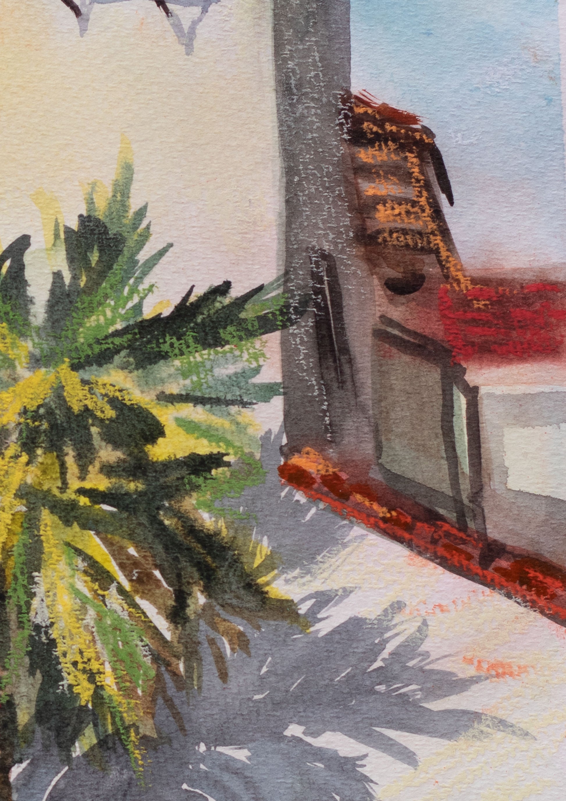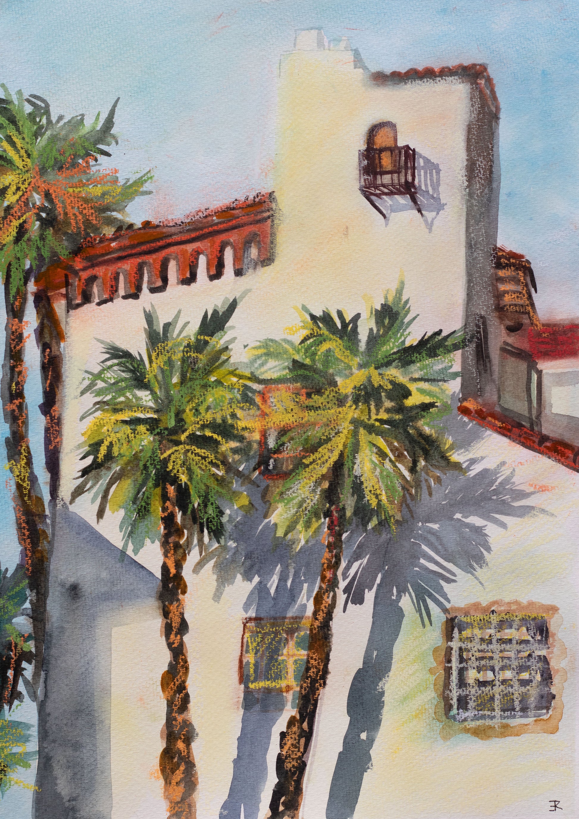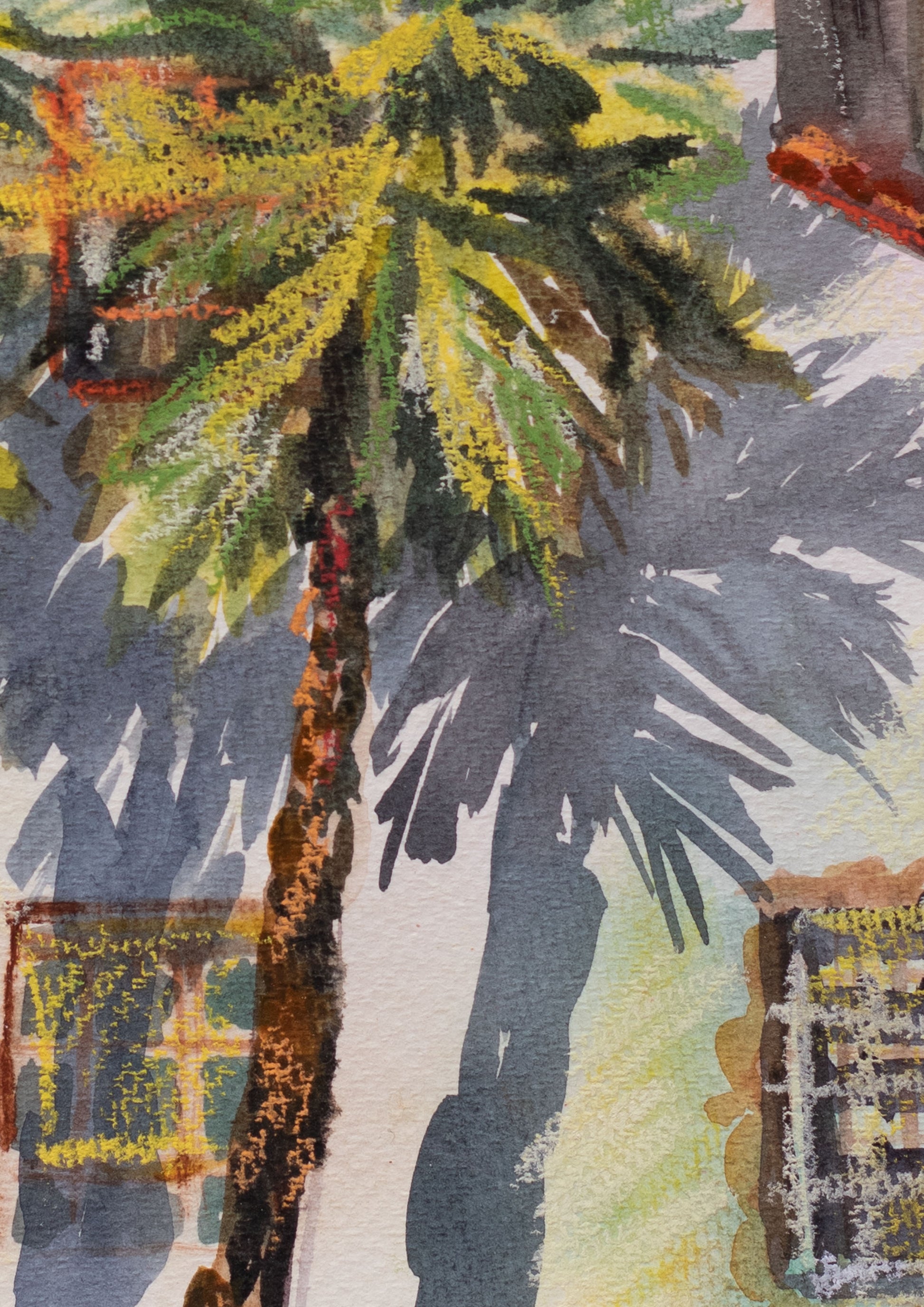 This watercolor painting captures a serene street scene from Glendale, California, featuring characteristic buildings framed by elegant palm trees and their soft shadows. The delicate brushwork highlights the interplay of light and texture, conveying the city's distinctive charm and relaxed atmosphere. Ideal for collectors and enthusiasts who appreciate refined urban landscapes with a subtle, artistic touch.