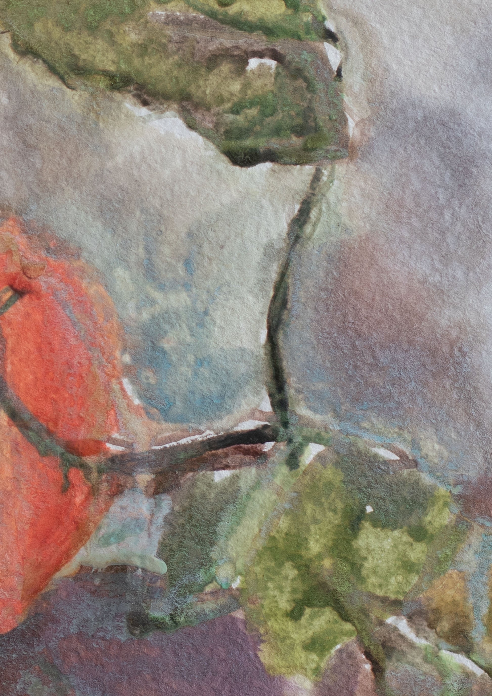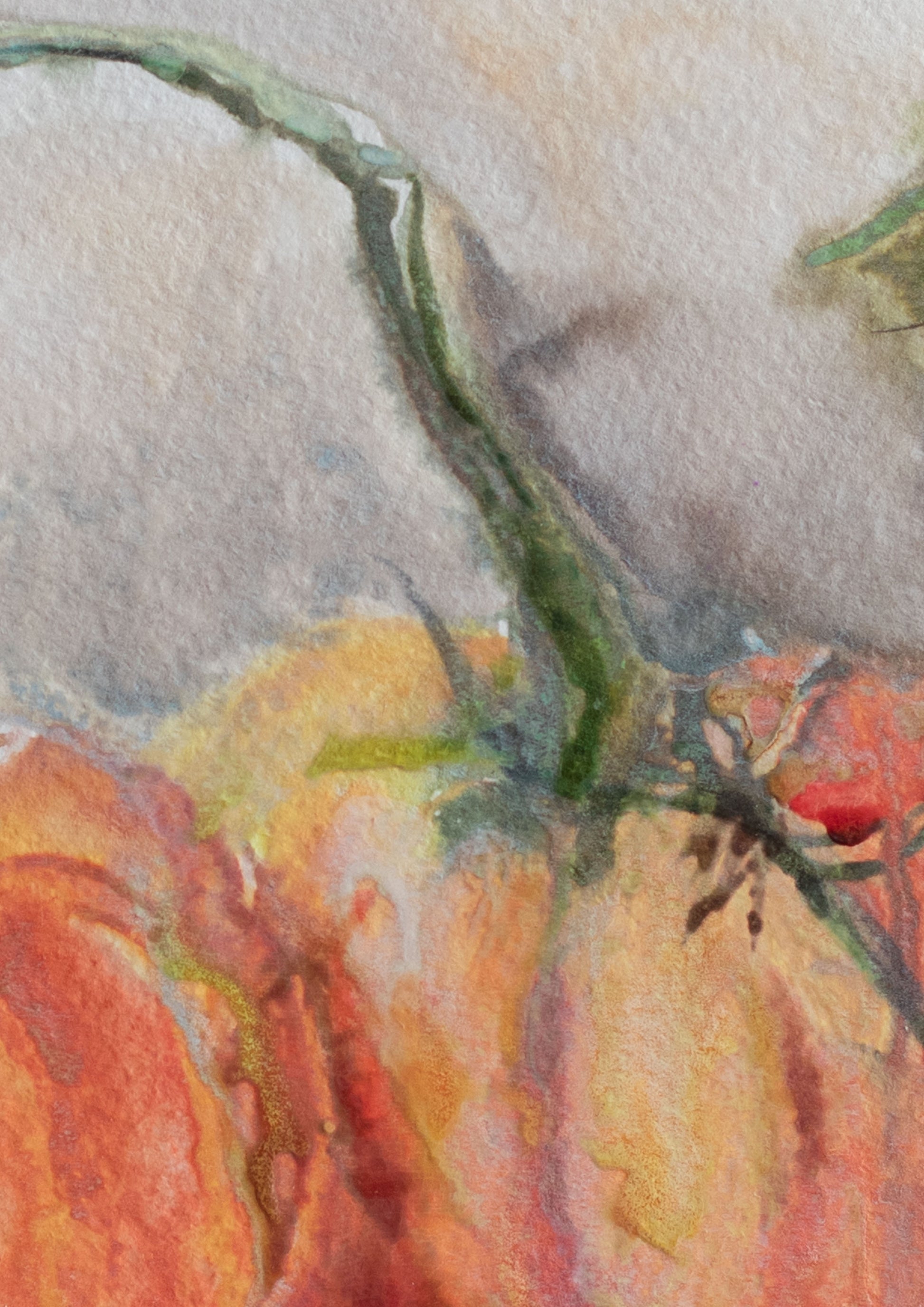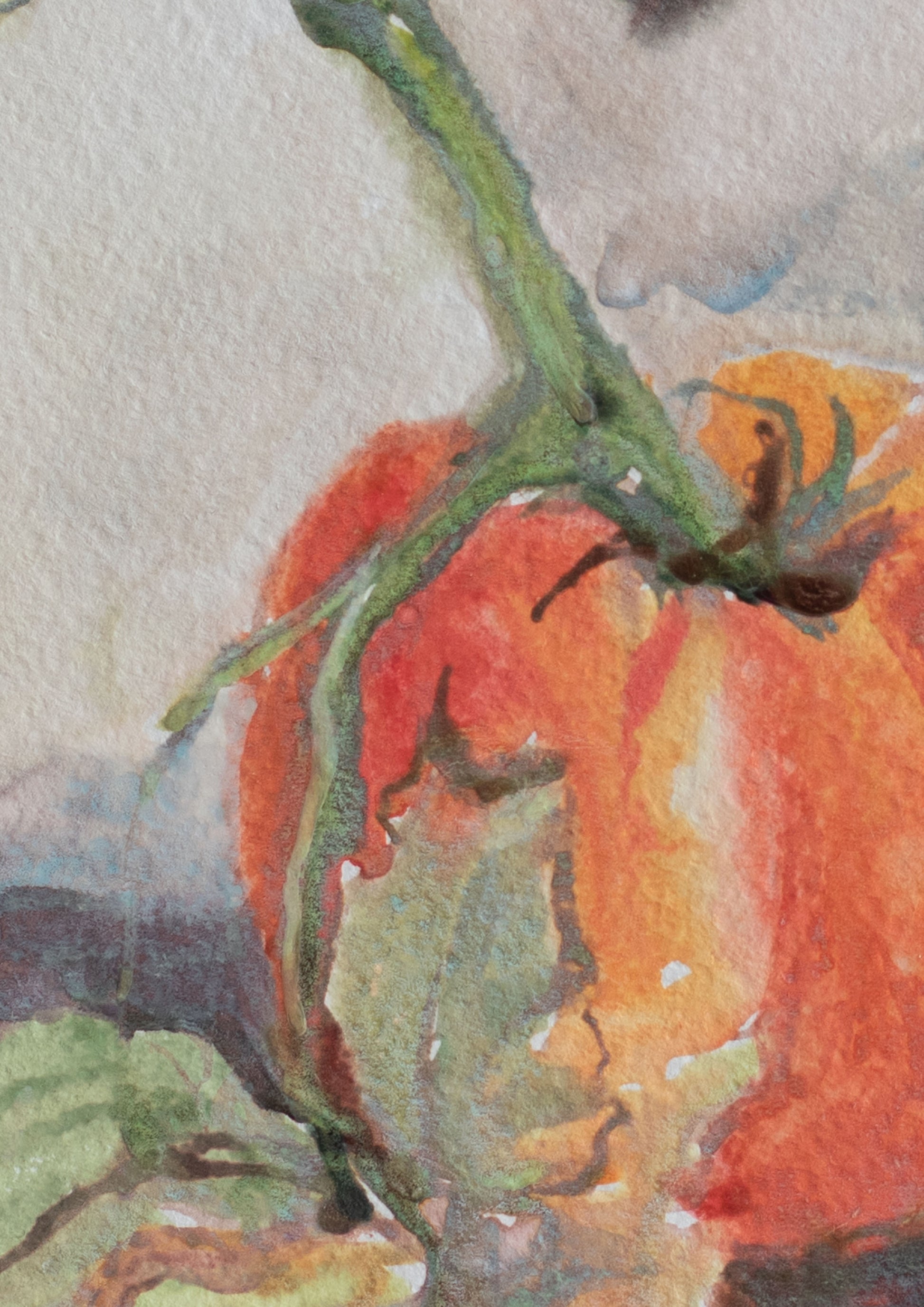 This watercolor painting, "Twilight Tomatoes," captures the serene beauty of ripe tomatoes bathed in the soft glow of dusk. Expertly rendered with delicate brushwork, the artwork highlights subtle color transitions and fine details, evoking a calm, natural ambiance. Perfect for art enthusiasts seeking a refined piece that blends botanical precision with an impressionistic touch.
