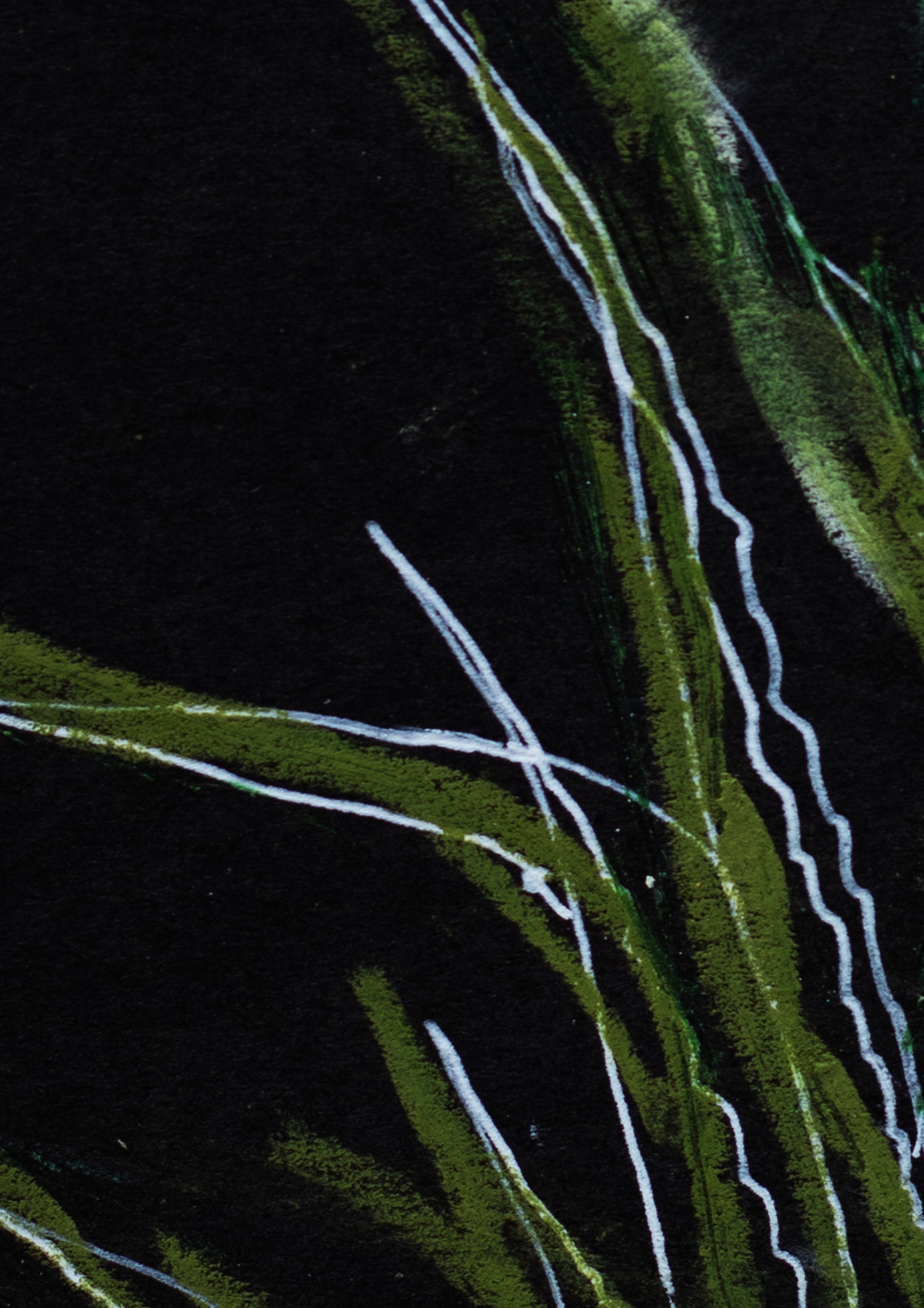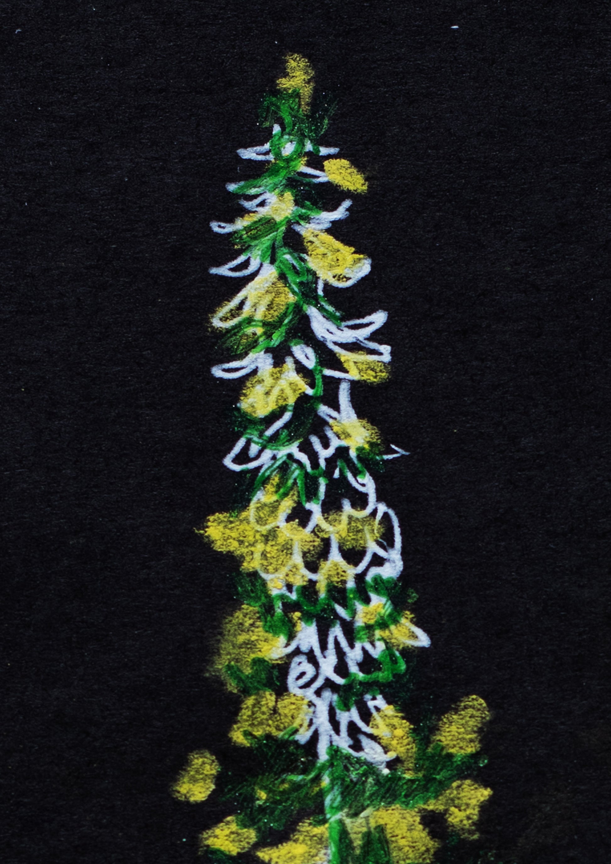 "Midnight Wildflower" captures the delicate beauty of a yellow flower rendered skillfully on black paper. Using pastel and white ink, the piece emphasizes contrast and texture, bringing the bloom to life with luminous detail. This artwork demonstrates expert mastery in blending light tones on a dark canvas, creating a striking and refined visual experience for discerning art collectors.